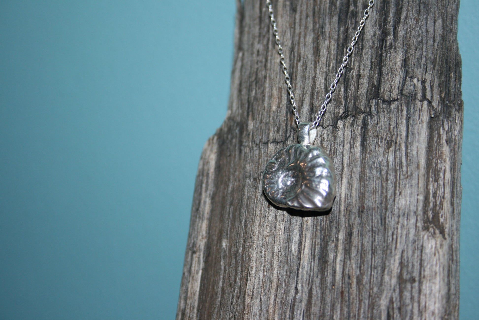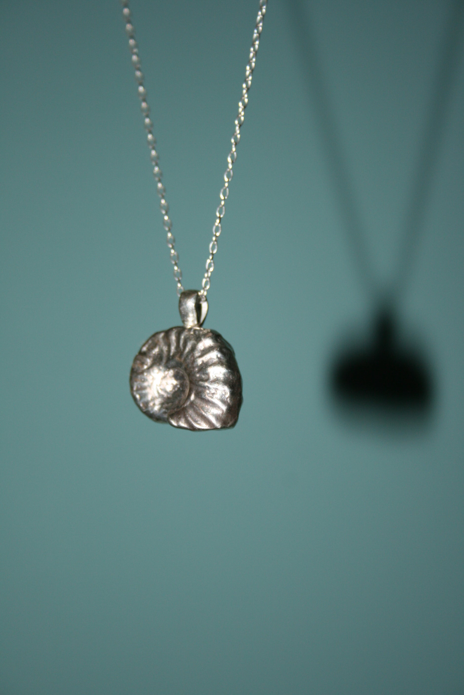 Ammonite form sand cast from 100% recycled sterling silver made from our very own workshop on the West Coast of Cumbria. Supplied with Sterling Silver 1.3mm Trace Chain 18"/45cm. 100% Recycled Silver.