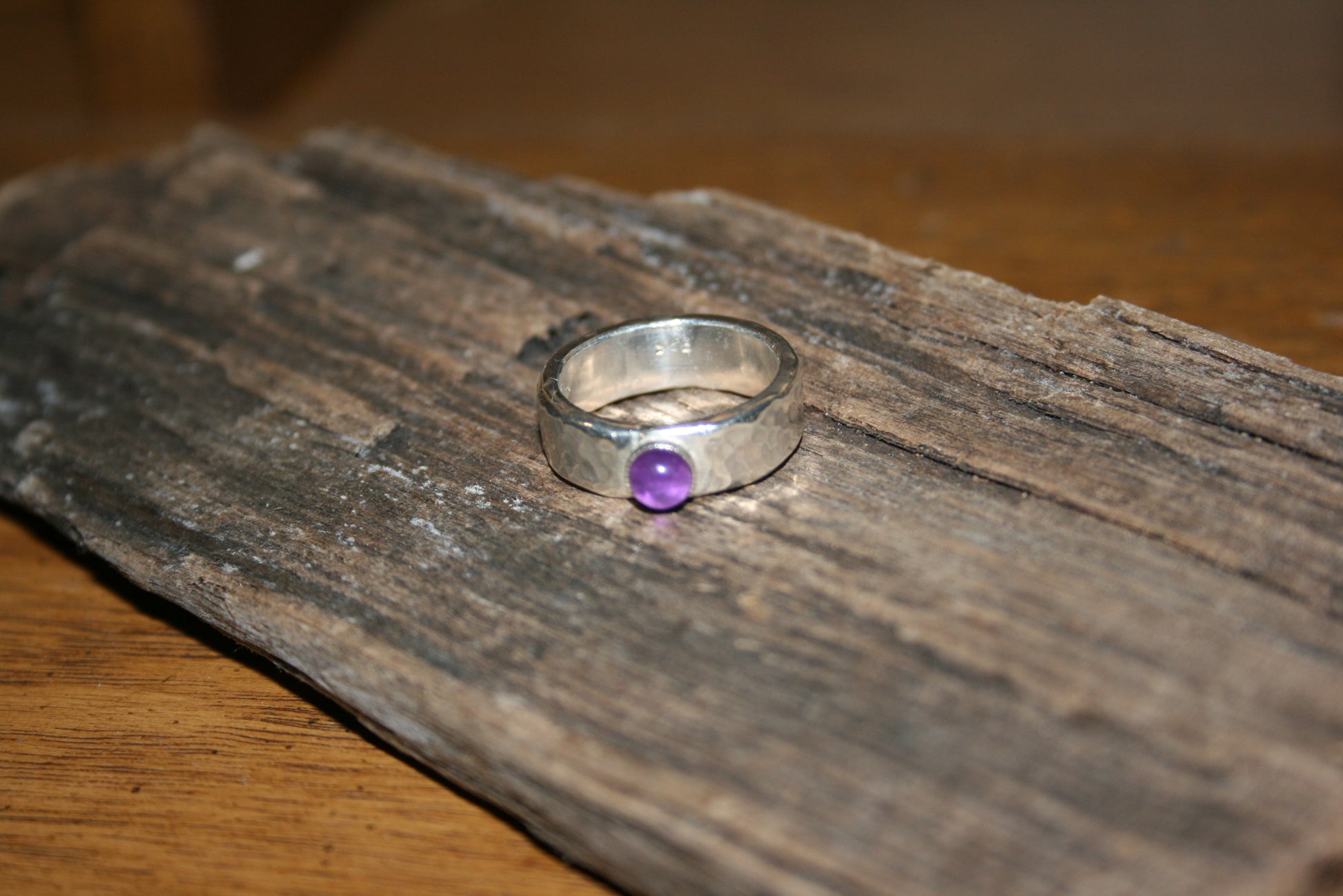 Chunky hammered amethyst bezel set ring handmade from 100% recycled sterling silver. Made in our very own workshop on the West Coast of Cumbria. UK size L, Resizing available (£20). Please follow the link and add resizing to cart if this is required.
