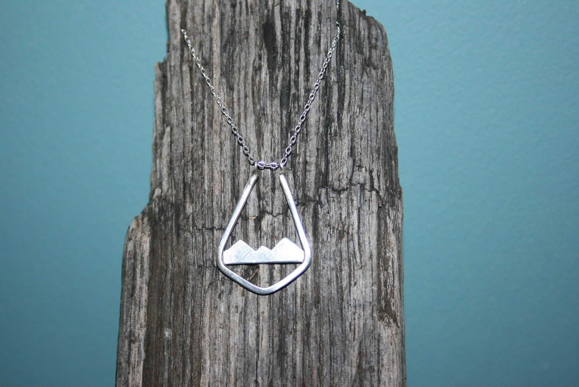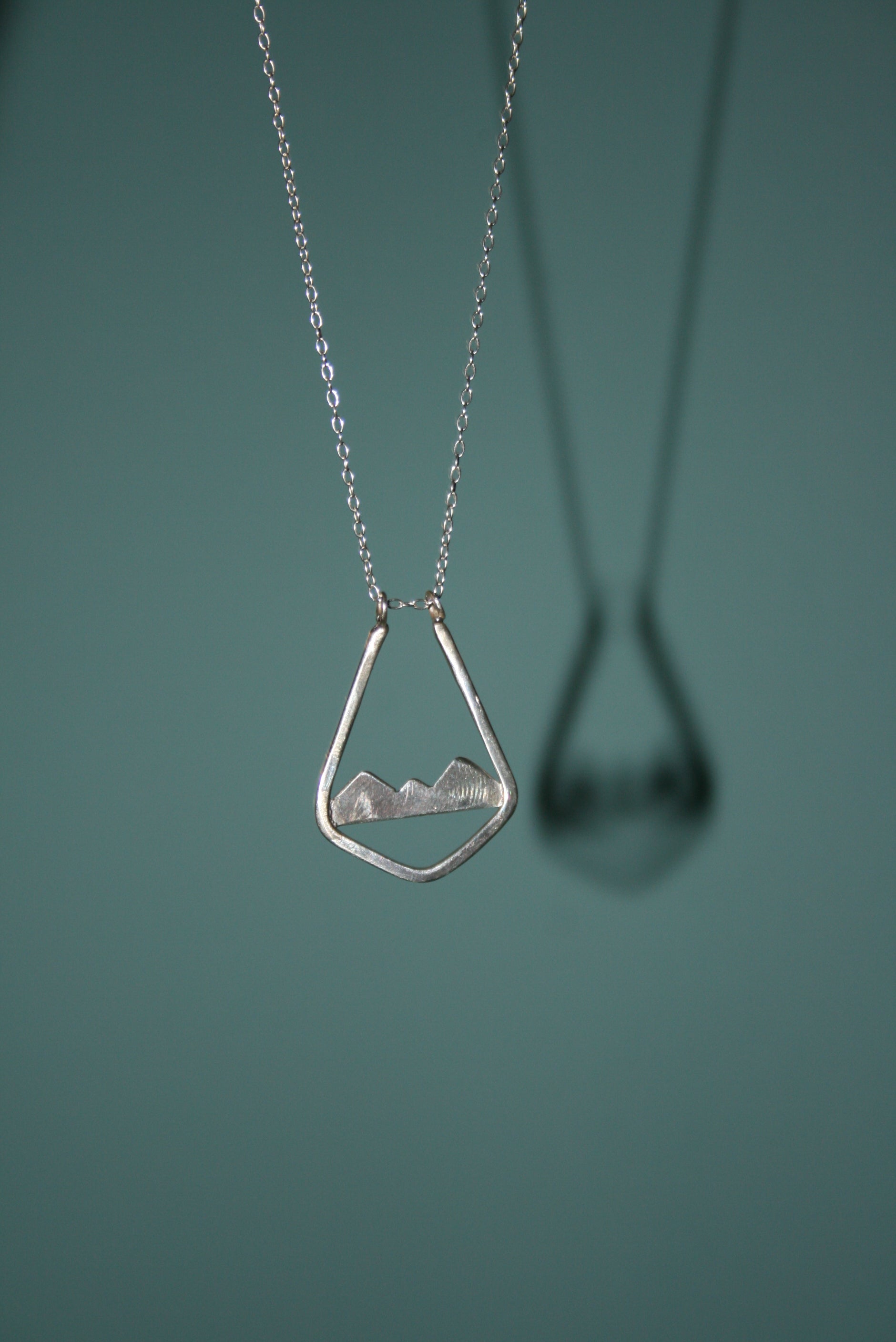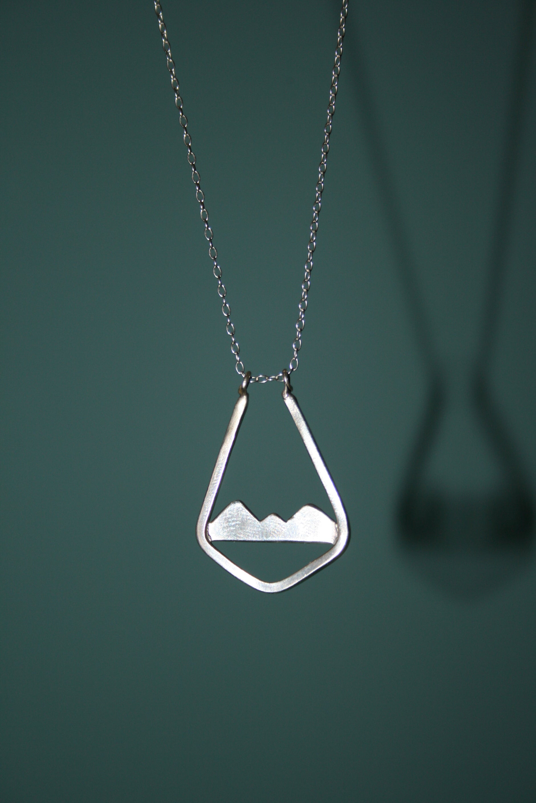 Ring holder necklace with mountain scene. Handmade from 100% recycled sterling silver in our very own workshop on the West Coast of Cumbria. Supplied with Sterling Silver 1.3mm Trace Chain 18"/45cm.